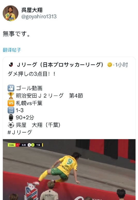 好在經(jīng)過一番檢查,吳屋大翔并無大礙,并回到球場繼續(xù)比賽,比賽結(jié)束后,吳屋大翔也轉(zhuǎn)發(fā)了自己“出糗”視頻,并寫道“平安無事?!保俅巫屒蛎詡儼残?。