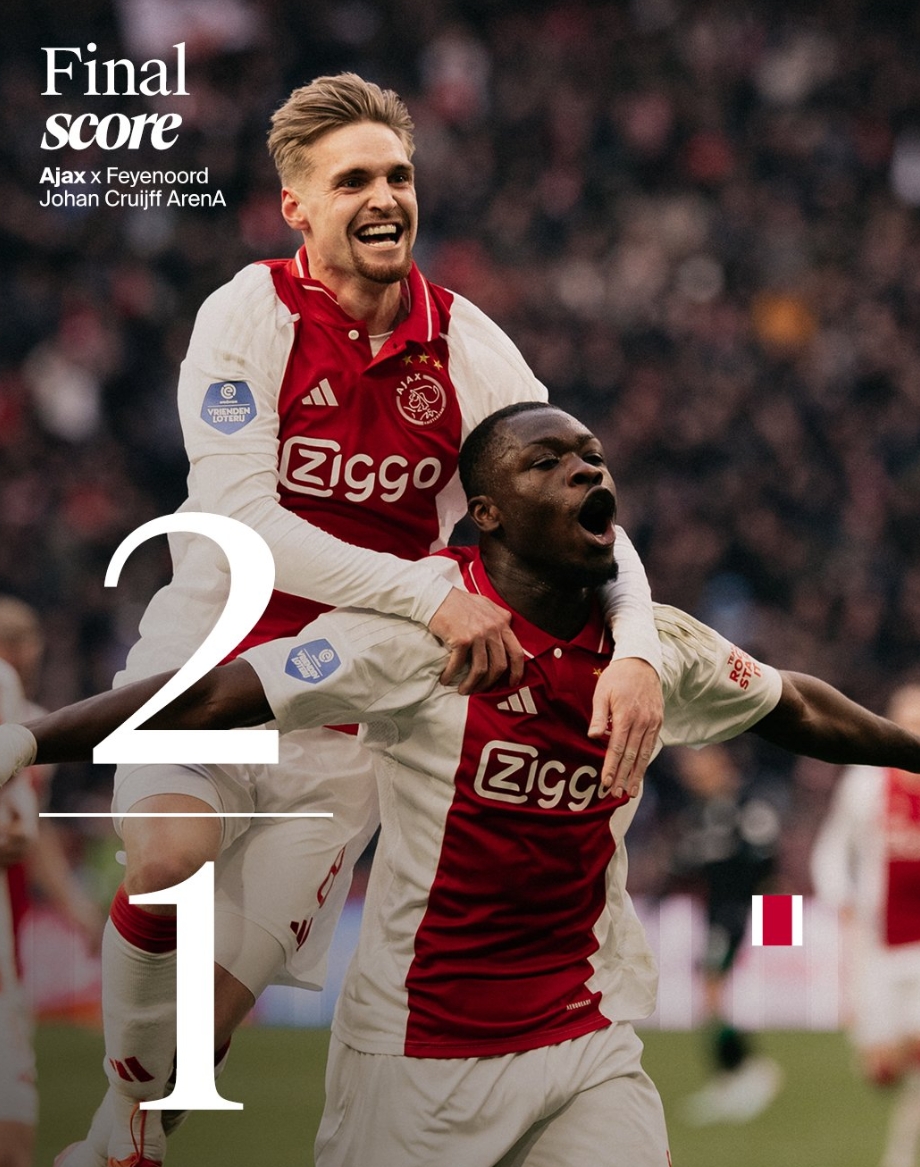 荷甲國家德比,阿賈克斯2-1費(fèi)耶諾德。上半場(chǎng),布羅比機(jī)敏補(bǔ)射破門;下半場(chǎng),廷貝爾扳平比分,韋霍斯特點(diǎn)球被撲,泰勒絕殺。