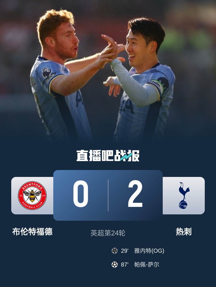 英超第24輪,熱刺2-0擊敗布倫特福德。上半場(chǎng),孫興慜角球制造烏龍,雅內(nèi)特將球碰進(jìn)自家球門;下半場(chǎng),維薩錯(cuò)失門前近距離機(jī)會(huì),孫興慜助攻薩爾鎖定勝局。