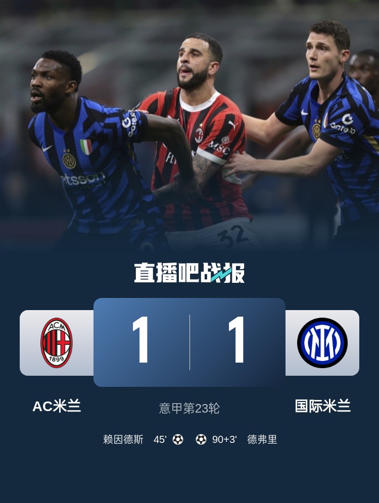 意甲第23輪,AC米蘭1-1國際米蘭。上半場(chǎng),迪馬爾科、勞塔羅兩度破門無效,賴因德斯補(bǔ)射打破僵局;下半場(chǎng),勞塔羅再度進(jìn)球被吹,比塞克、圖拉姆和鄧弗里斯三度中柱,扎萊夫斯基助攻德弗里補(bǔ)時(shí)扳平。