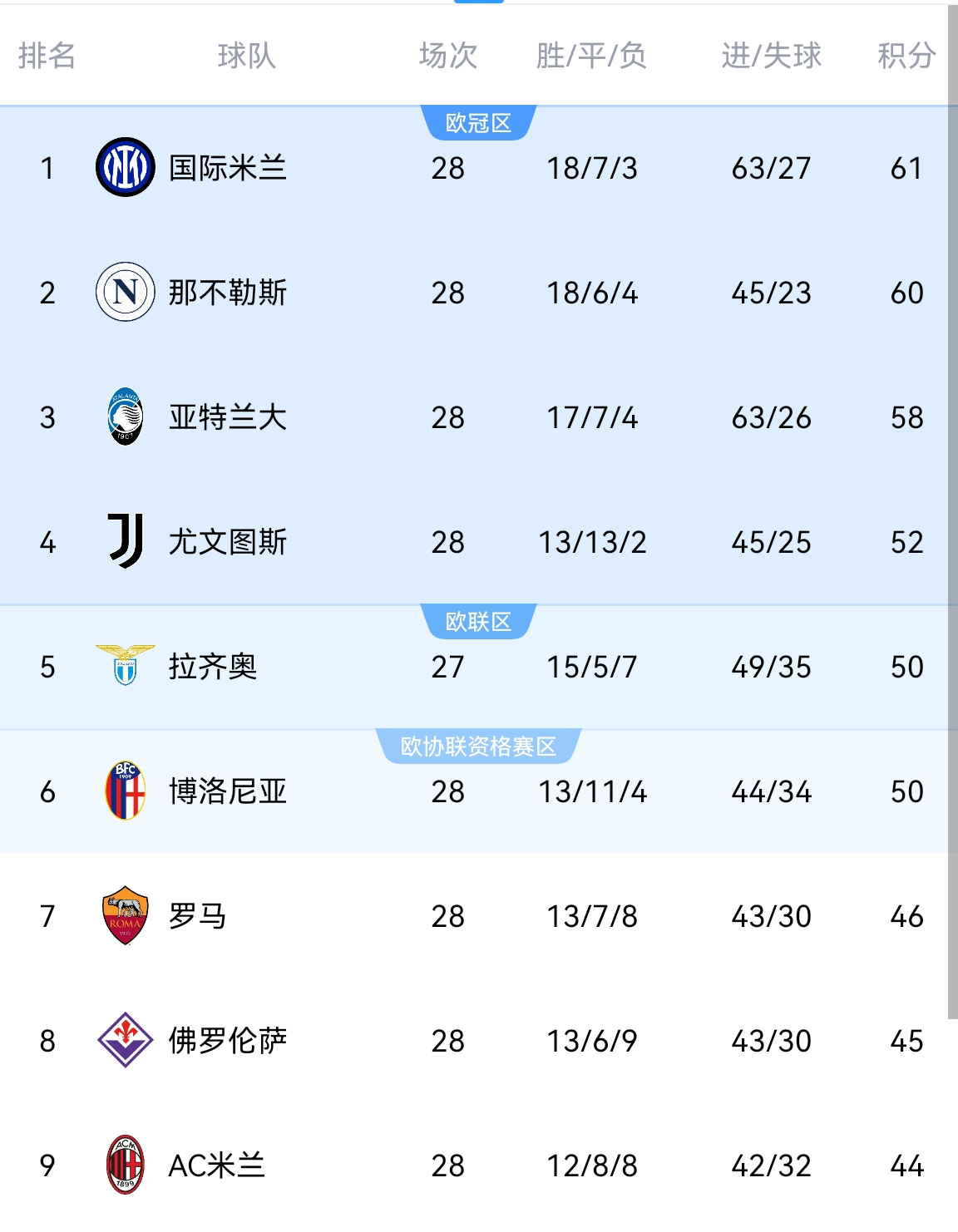 目前尤文聯(lián)賽排名第4,落后榜首9分,領先第5和第6名2分。