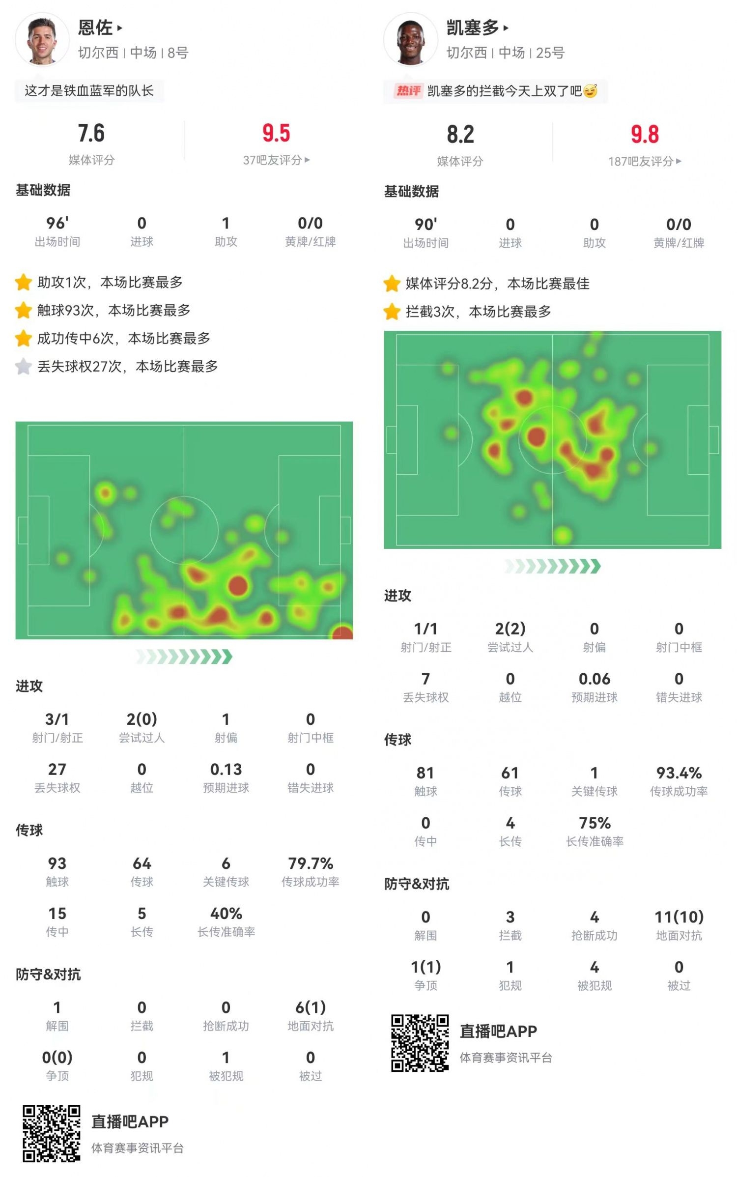 本場(chǎng)比賽恩佐與凱塞多的發(fā)揮可圈可點(diǎn)?!皣L試助攻王”恩佐總算“撿”到一個(gè)助攻,庫(kù)庫(kù)雷利亞的制勝球便是由恩佐傳導(dǎo)。凱塞多則繼續(xù)自己的戰(zhàn)神級(jí)發(fā)揮,本場(chǎng)比賽貢獻(xiàn)12次對(duì)抗11次成功,還有3攔截4搶斷0被過的鐵閘表現(xiàn)。切爾西的雙腰進(jìn)可攻退可守,正是藍(lán)軍本賽季戰(zhàn)績(jī)不錯(cuò)的原因之一。