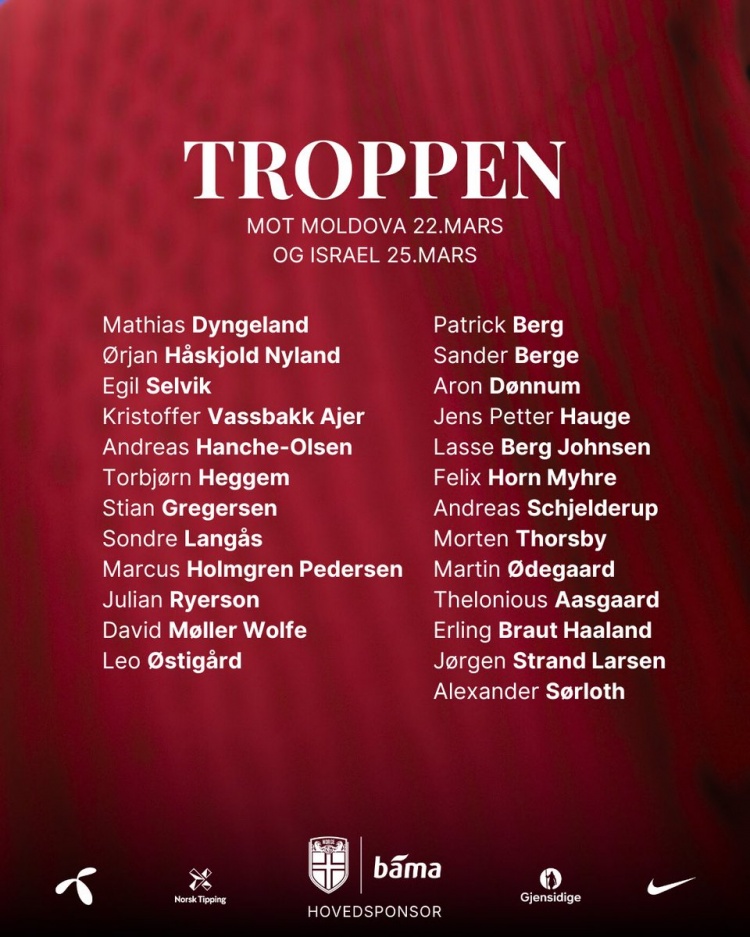 中前場(chǎng):帕特里克-伯格(博德閃耀)、桑德-博格(富勒姆)、冬納姆(圖盧茲)、彼得-海于格(博德閃耀)、貝格-約翰森(馬爾默)、米赫埃(布蘭)、謝爾德魯普(本菲卡)、托斯比(熱那亞)、厄德高(阿森納)、阿斯高(盧頓)、哈蘭德(曼城)、拉爾森(狼隊(duì))、索爾洛特(馬競(jìng))