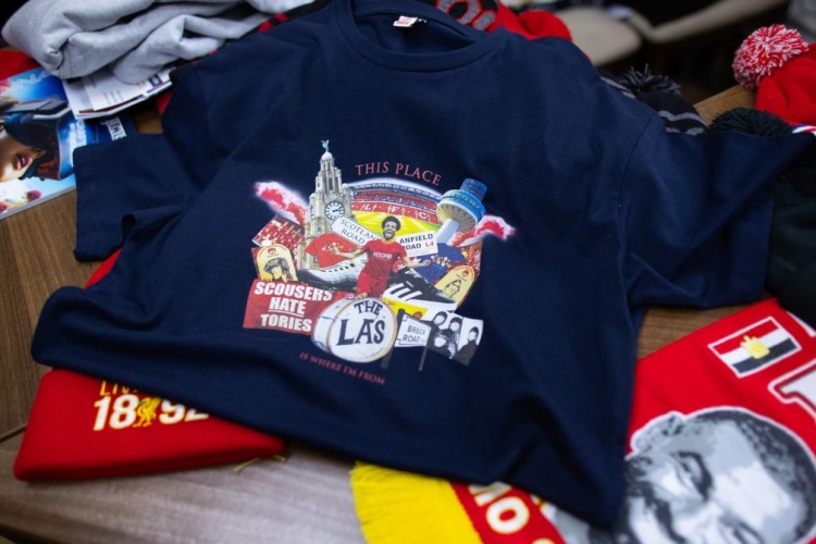 在距離利物浦主場(chǎng)安菲爾德只有5分鐘步行路程的一家商店里,你可以看到當(dāng)?shù)卣诔鍪垡患?0鎊的T恤,上面印有目前利物浦這座城市的標(biāo)志:樂(lè)隊(duì)披頭士和The La's、地標(biāo)性建筑皇家利物大廈和利物浦電臺(tái)城塔,以及薩拉赫。