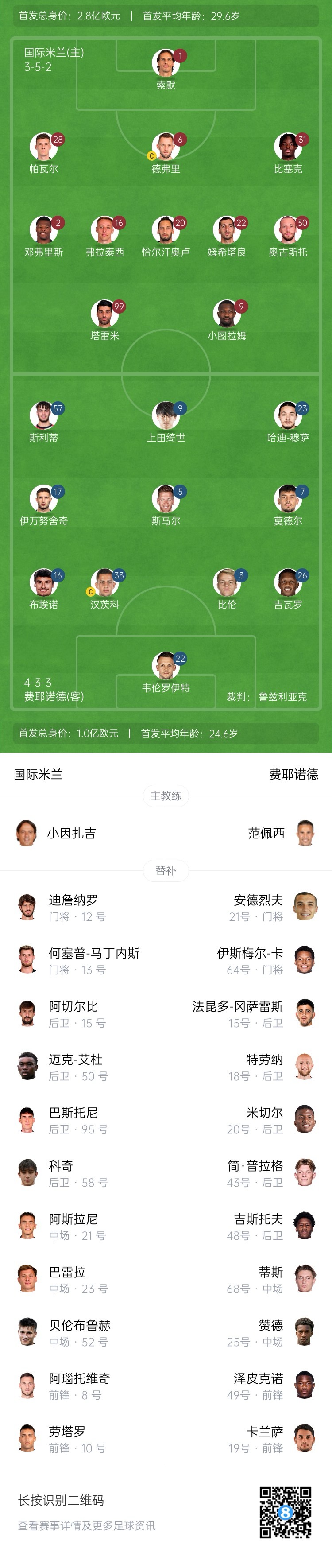 3月12日訊 歐冠16強(qiáng)次回合,國(guó)米主場(chǎng)迎戰(zhàn)費(fèi)耶諾德比賽即將打響。賽前首發(fā)出爐。