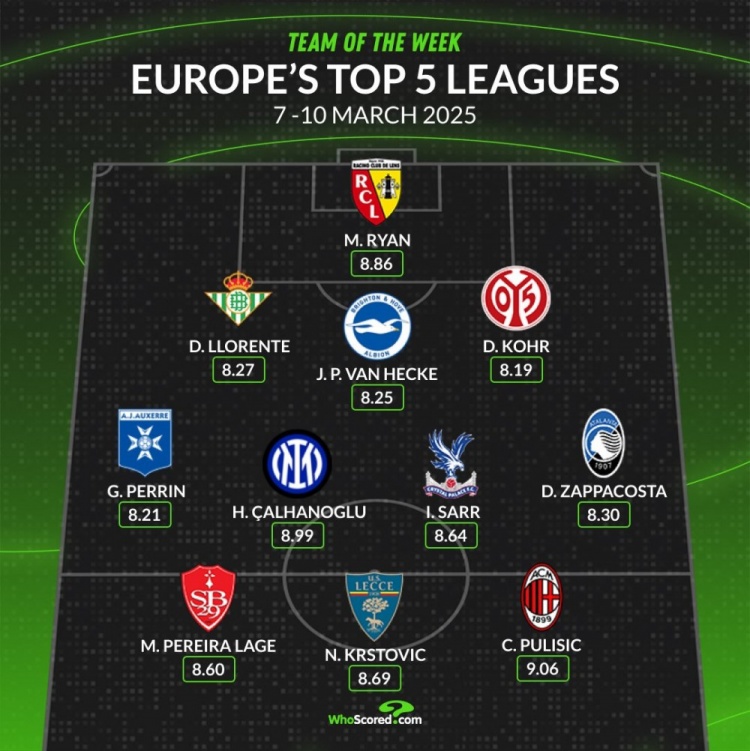 3月12日訊 本周五大聯(lián)賽已經(jīng)全部完賽,whoscored也統(tǒng)計了本周五大聯(lián)賽最佳陣容,意甲4將在列。