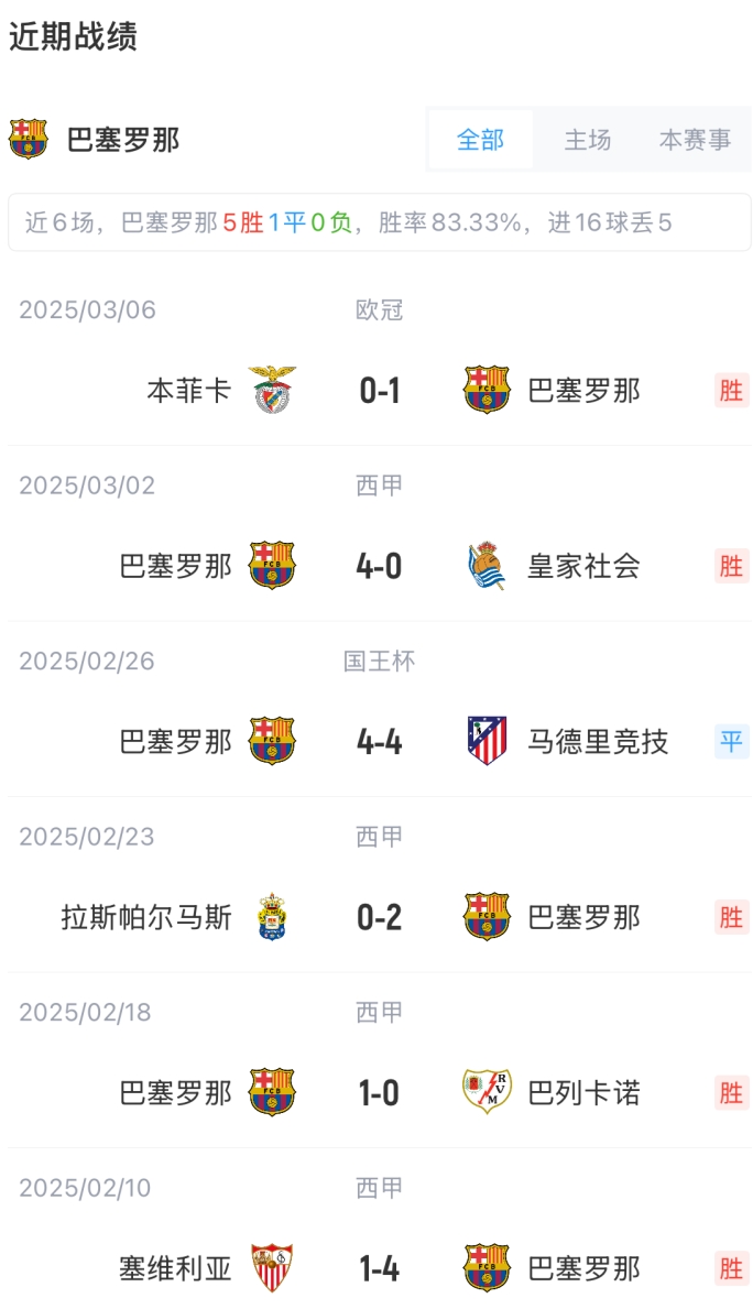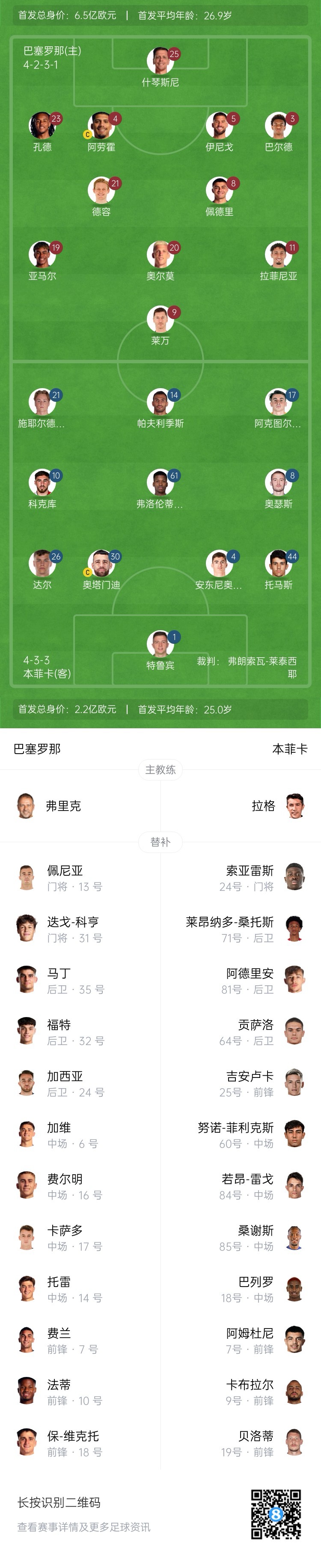巴薩首發(fā):25-什琴斯尼、3-巴爾德、4-阿勞霍、5-伊尼戈-馬丁內(nèi)斯、23-孔德、21-德容、8-佩德里、20-奧爾莫、19-亞馬爾、11-拉菲尼亞、9-萊萬(wàn)