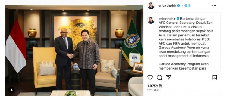 托希爾在社媒配文寫道:“今日會(huì)見了亞足聯(lián)秘書長拿督溫莎-約翰,會(huì)上我們共同就亞洲足球未來的發(fā)展方向進(jìn)行探討,此外還討論了印尼足協(xié)與亞足聯(lián)、國際足聯(lián)合作開辦的雄鷹足球?qū)W院項(xiàng)目,以進(jìn)一步促進(jìn)印尼足球的發(fā)展?!?/p>