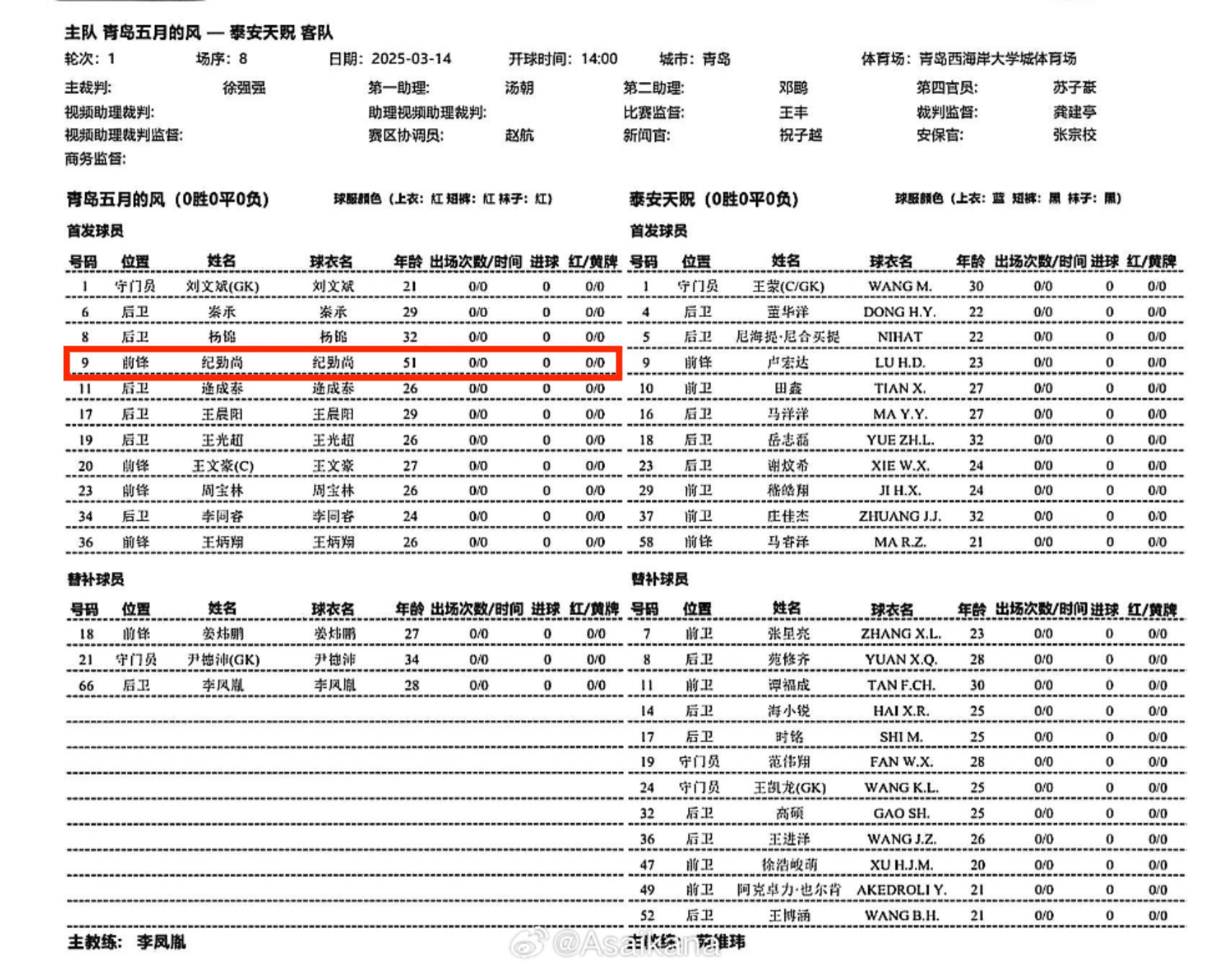 中冠球隊(duì)青島五月的風(fēng)將對(duì)陣中乙球隊(duì)泰安天貺。根據(jù)首發(fā)名單,青島五月的風(fēng)投資人、51歲的紀(jì)勤尚將先發(fā)出戰(zhàn),擔(dān)任前鋒。 ???