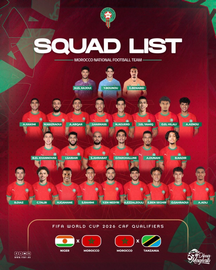 3月14日訊 摩洛哥公布最新一期國(guó)家隊(duì)名單,阿什拉夫、馬茲拉維、布拉欣-迪亞斯、恩-內(nèi)斯里、阿姆拉巴特等球員入選。