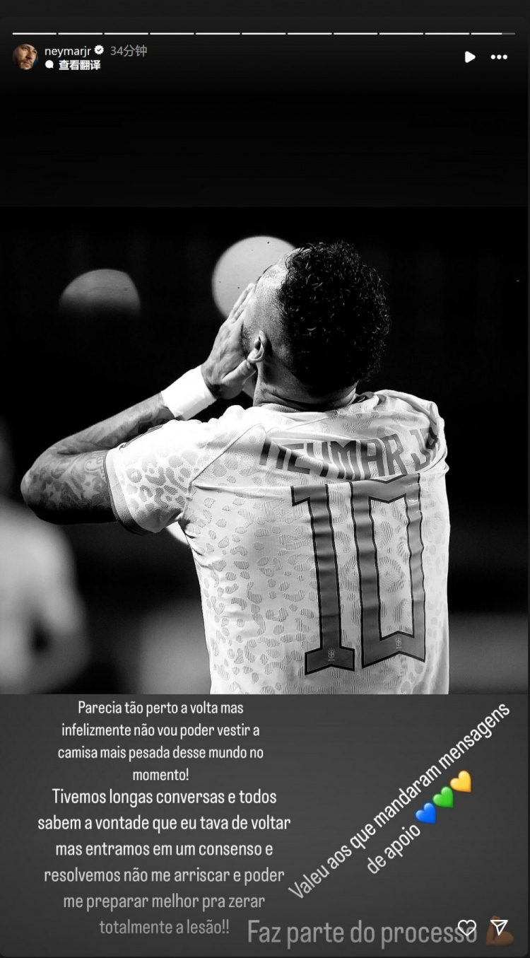 內(nèi)馬爾寫道:“看似回歸近在咫尺,但遺憾的是,目前我還無法穿上這件世界上最具分量的球衣!我們進行了長時間的交談,大家都知道我渴望回歸的心情,但我們(在溝通后)達成了共識,決定不冒險,而是更好地做好準備,等傷病完全痊愈!這是整個過程的一部分???”
