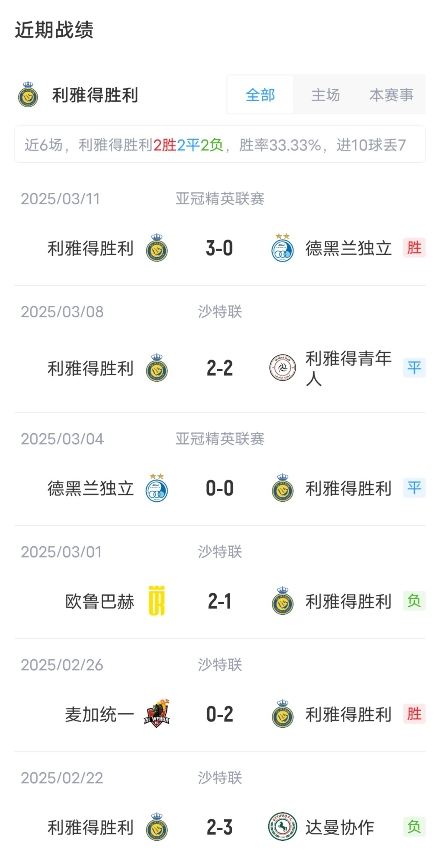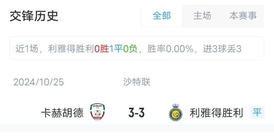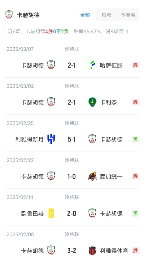 目前利雅得勝利取得了14勝6平4負(fù)的成績(jī),積48分,暫居聯(lián)賽第4。卡赫胡德取得了9勝4平11負(fù)成績(jī),積31分,暫居聯(lián)賽第10。