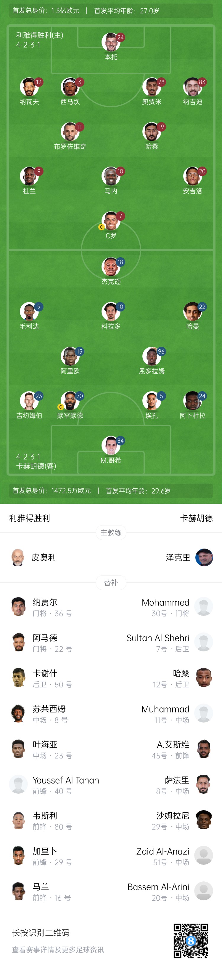 利雅得勝利替補(bǔ):36-納賈爾、22-阿馬德、50-卡謝什、8-蘇萊西姆、23-葉海亞、80-韋斯利、29-加里卜、16-馬蘭