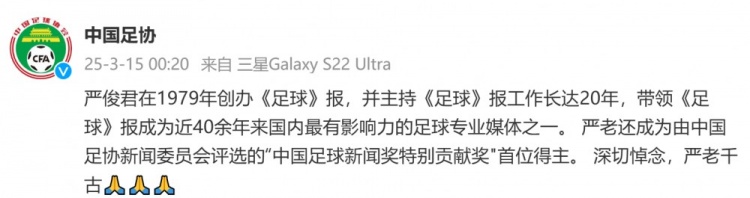 嚴(yán)俊君在1979年創(chuàng)辦《足球》報(bào),并主持《足球》報(bào)工作長(zhǎng)達(dá)20年,帶領(lǐng)《足球》報(bào)成為近40余年來(lái)國(guó)內(nèi)最有影響力的足球?qū)I(yè)媒體之一。 嚴(yán)老還成為由中國(guó)足協(xié)新聞委員會(huì)評(píng)選的“中國(guó)足球新聞獎(jiǎng)特別貢獻(xiàn)獎(jiǎng)"首位得主。 深切悼念,嚴(yán)老千古????????????