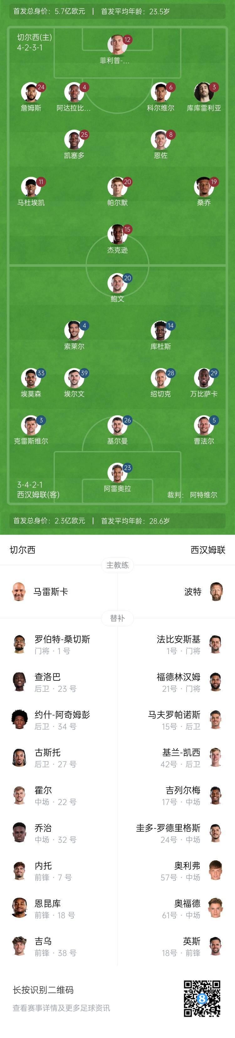 切爾西首發(fā):12-約根森、24-里斯-詹姆斯、4-阿達拉比奧尤、6-科爾維爾、3-庫庫雷利亞、25-凱塞多、8-恩佐、11-馬杜埃凱、20-帕爾默、19-桑喬、15-杰克遜