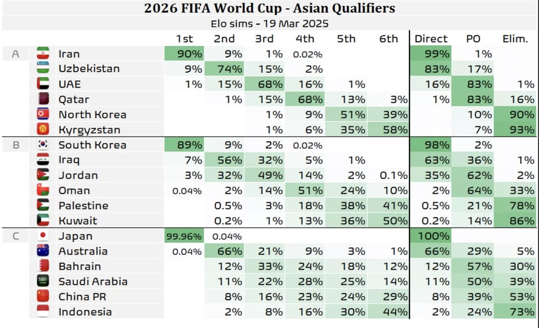 其中A組的伊朗(99%)、B組的韓國(98%)、C組的日本(100%)基本鎖定了直通世界杯的名額。