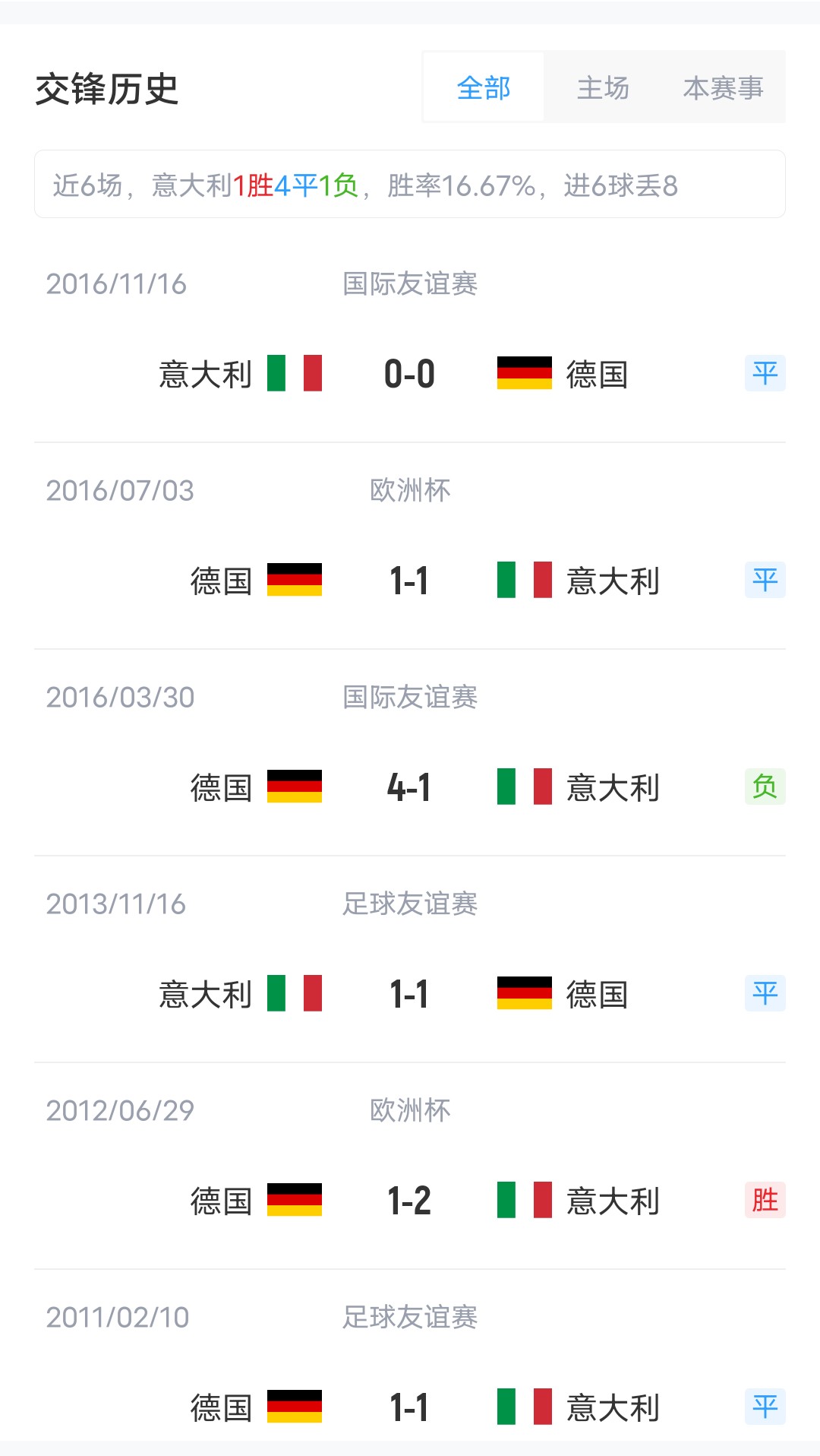 在歐國聯(lián)小組賽中,意大利排名B組第2,德國排名C組第1;雙方近6場直接對話中,意大利取得了1勝4平1負的戰(zhàn)績。兩隊最近一次交手,是在2016年11月16日,友誼賽意大利0-0戰(zhàn)平德國。