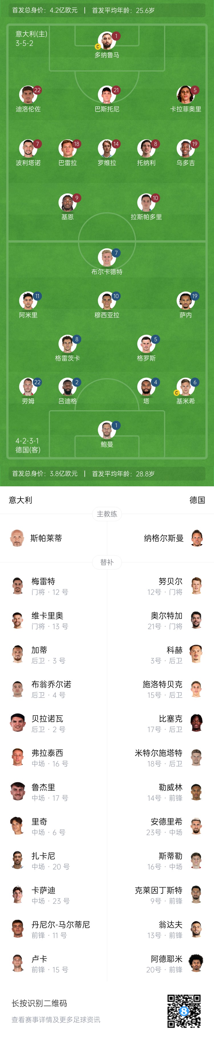 3月21日訊 北京時間今天3點45分,歐國聯(lián)1/4賽決賽首回合,意大利主場迎戰(zhàn)德國。賽前雙方公布首發(fā)陣容。