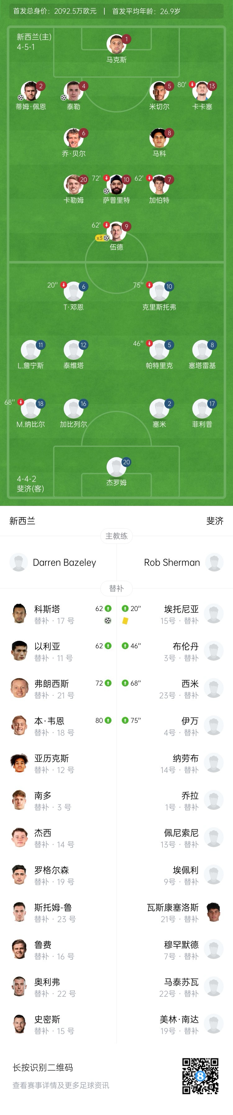 新西蘭目前FIFA排名第89名,比中國隊(duì)高一名(中國FIFA第90),新西蘭陣中頭號前鋒是效力于諾丁漢森林的伍德,身價(jià)1000萬歐。