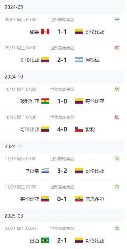 哥倫比亞在世預(yù)賽已經(jīng)遭遇3連敗,而在其美洲杯決賽不敵阿根廷之后,球隊(duì)在近7場(chǎng)比賽只取得2勝1平4負(fù)。具體戰(zhàn)績?nèi)缦拢?/p>