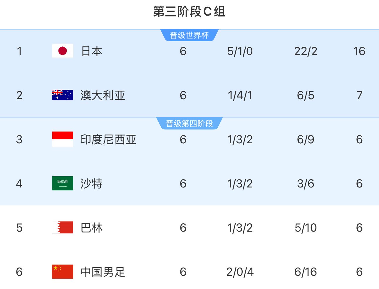 18強賽C組第7輪,日本2-0巴林提前3輪直通世界杯,澳大利亞5比1印尼成為本組第二個拿到10分的球隊,沙特在本組最后一場比賽中戰(zhàn)勝中國,率先拿到9分。