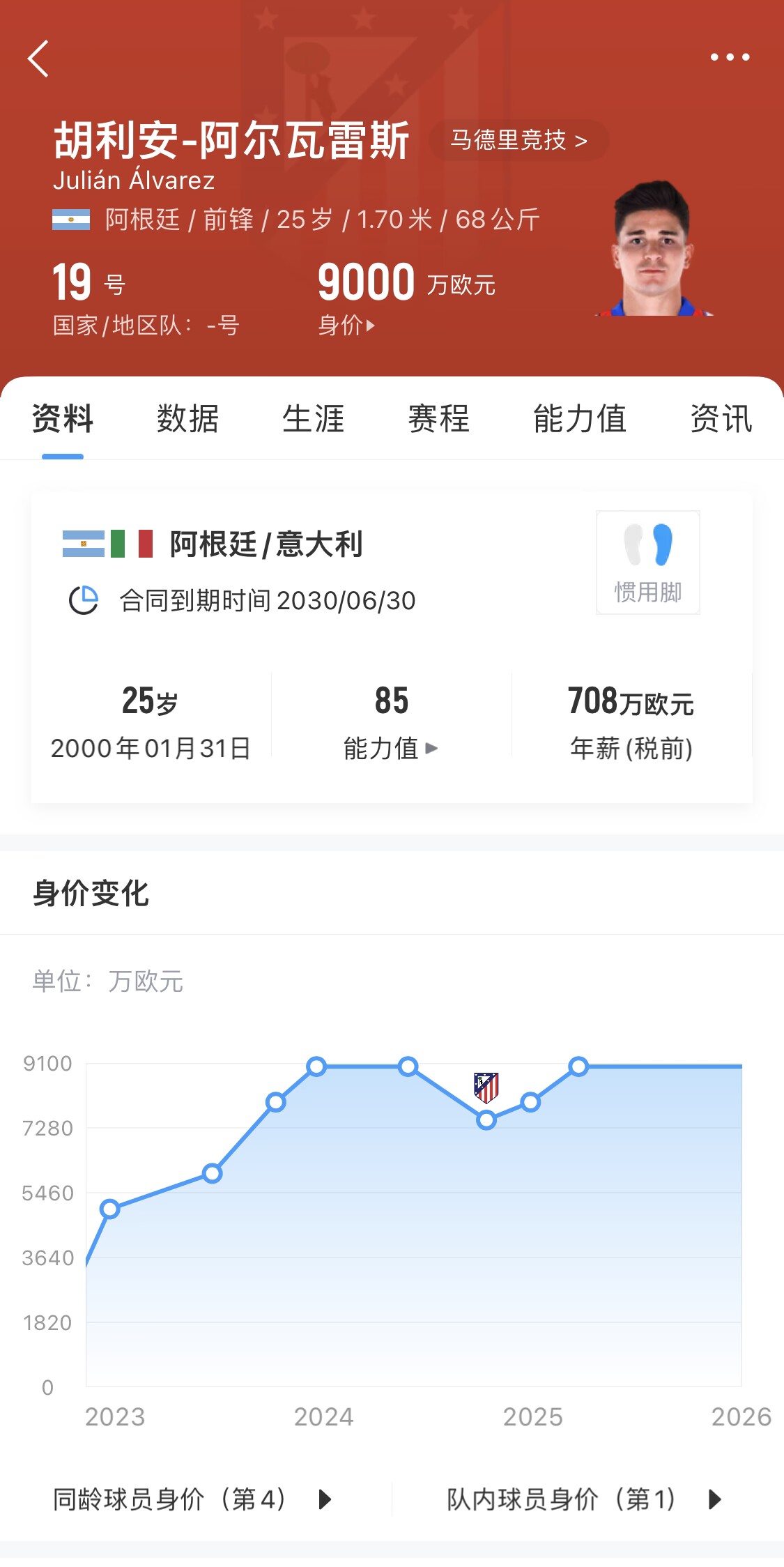 03月22日訊 昨日德轉(zhuǎn)更新西甲球員身價(jià),阿爾瓦雷斯的身價(jià)重新回到9000萬歐,但沒有破億。