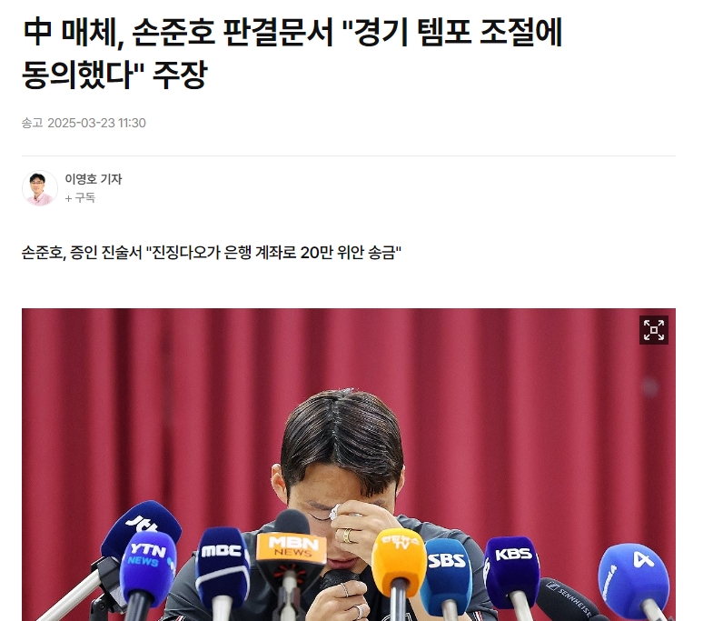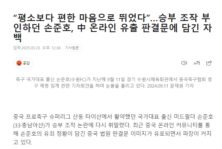 韓媒標題:“我比平時更放松心態(tài)比賽”孫準浩否認操縱比賽,但在中國網(wǎng)絡(luò)上泄露的判決書中承認了這一罪行。