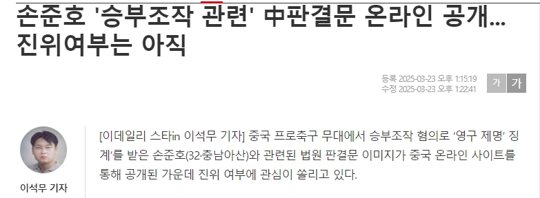 edaily標題:孫準浩假球案判決書在網(wǎng)上發(fā)布,真實性尚不清楚。