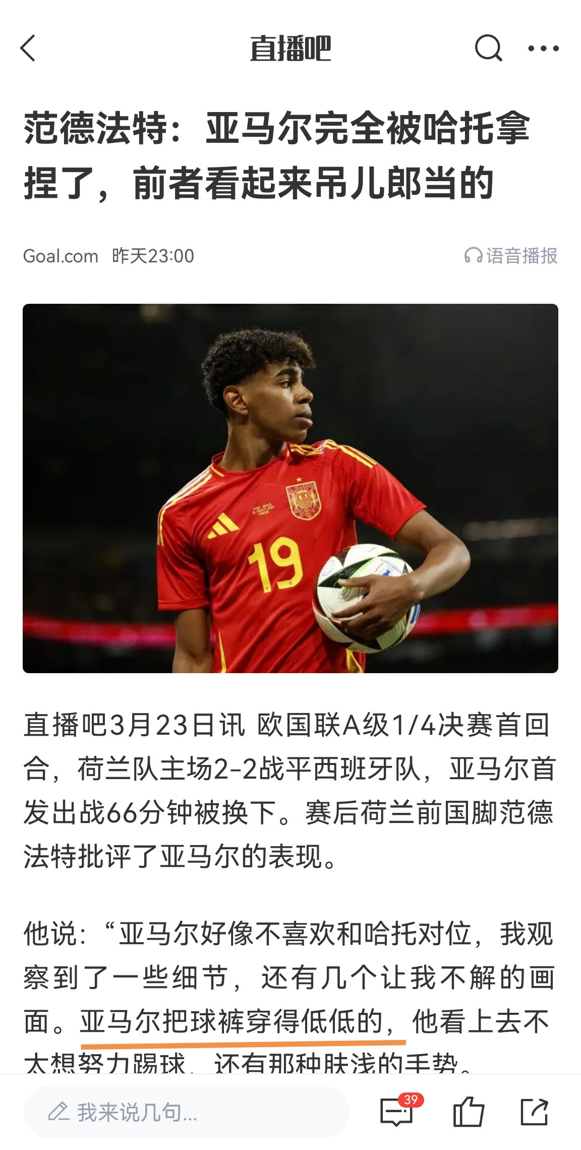 亞馬爾的這一動作顯然是有意為之。就在這場比賽前,荷蘭名宿范德法特批評了亞馬爾在首回合的表現(xiàn),甚至認為亞馬爾“亞馬爾把球褲穿得低低的,他看上去不太想努力踢球,還有那種膚淺的手勢”。
