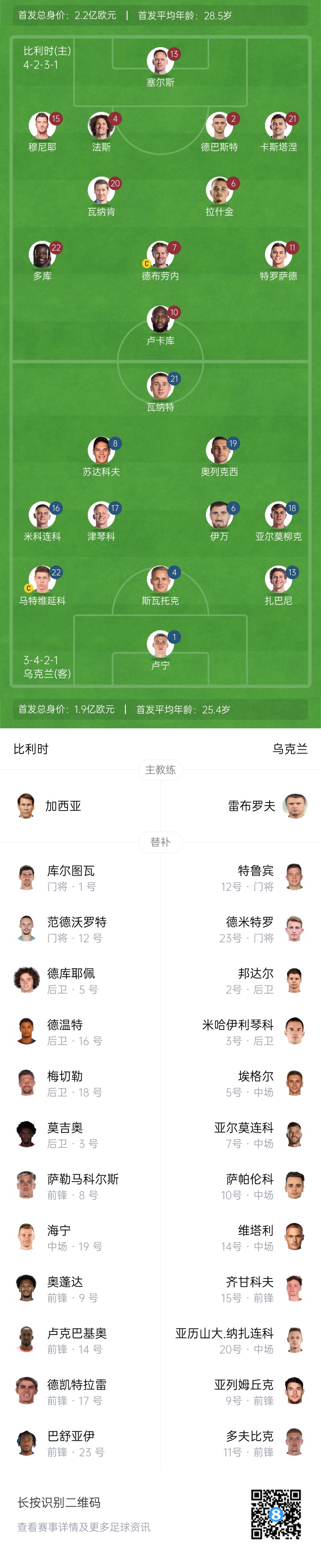 歐國聯(lián)-比利時vs烏克蘭首發(fā):盧卡庫、德布勞內(nèi)先發(fā),多庫出戰(zhàn)