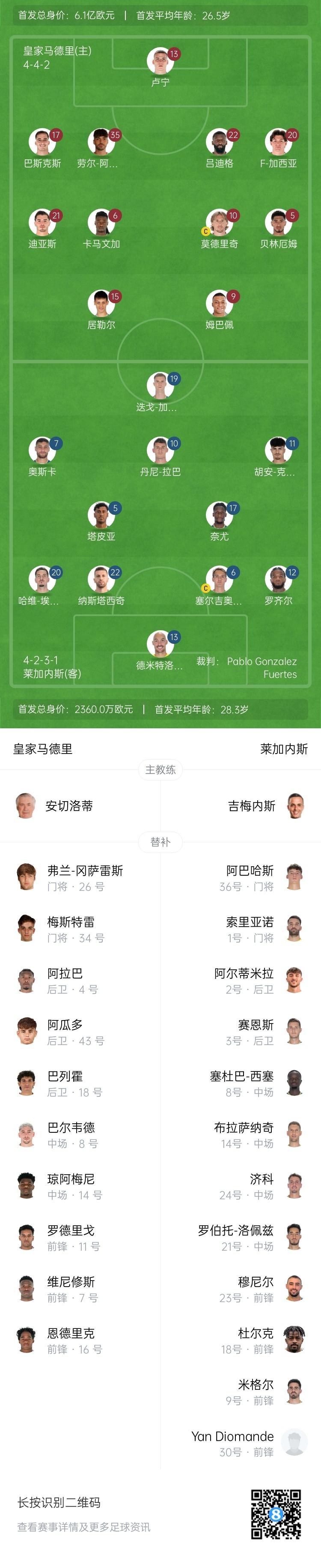 皇馬首發(fā):13-盧寧、17-巴斯克斯、35-勞爾-阿森西奧、22-呂迪格、20-弗蘭-加西亞、15-居勒爾、10-莫德里奇、6-卡馬文加、5-貝林厄姆、21-迪亞斯、9-姆巴佩