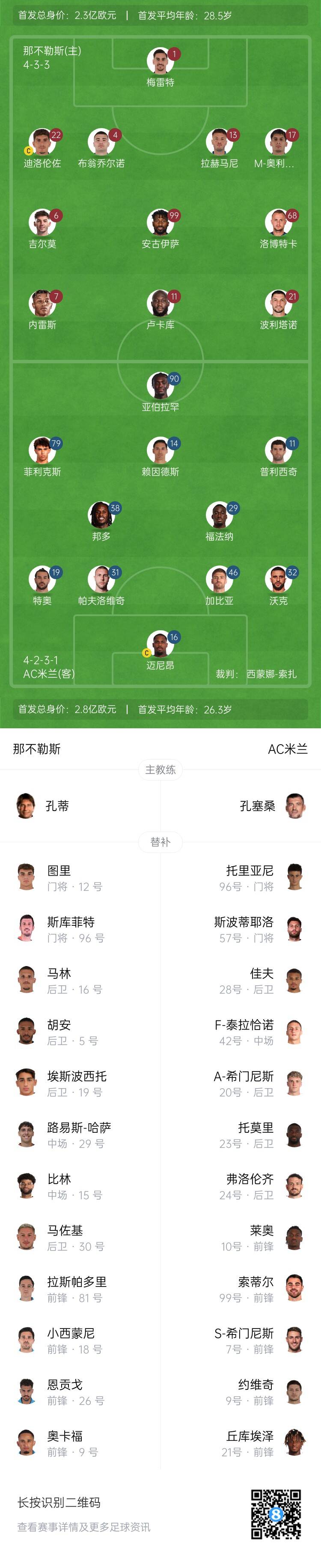3月31日訊 意甲第30輪,那不勒斯主場(chǎng)對(duì)陣AC米蘭。賽前,官方公布了本場(chǎng)的首發(fā)名單。