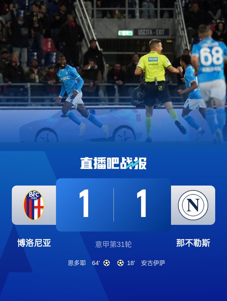 那不勒斯1-1戰(zhàn)平博洛尼亞,落后榜首國米3分。