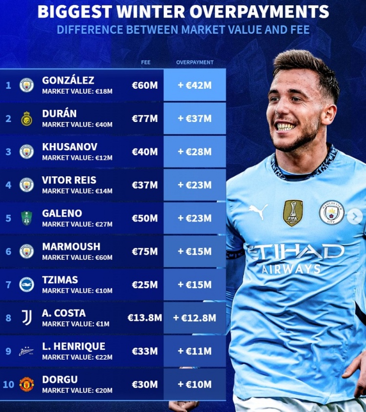 2月5日訊 五大聯(lián)賽冬窗已經(jīng)結(jié)束,《轉(zhuǎn)會市場》也列出了冬窗溢價引援榜,前六中曼城占據(jù)4席。