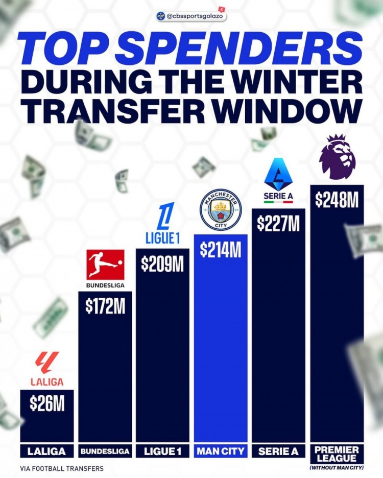 破費(fèi)2.18億歐元簽入5名球員,超過西甲、德甲和法甲整個(gè)聯(lián)賽的花費(fèi),僅支付的溢價(jià)便超過1億歐元,過去的這個(gè)冬窗是屬于曼城的獨(dú)角戲,瓜迪奧拉已經(jīng)做好了圍繞哈蘭德進(jìn)行全面重建的準(zhǔn)備。