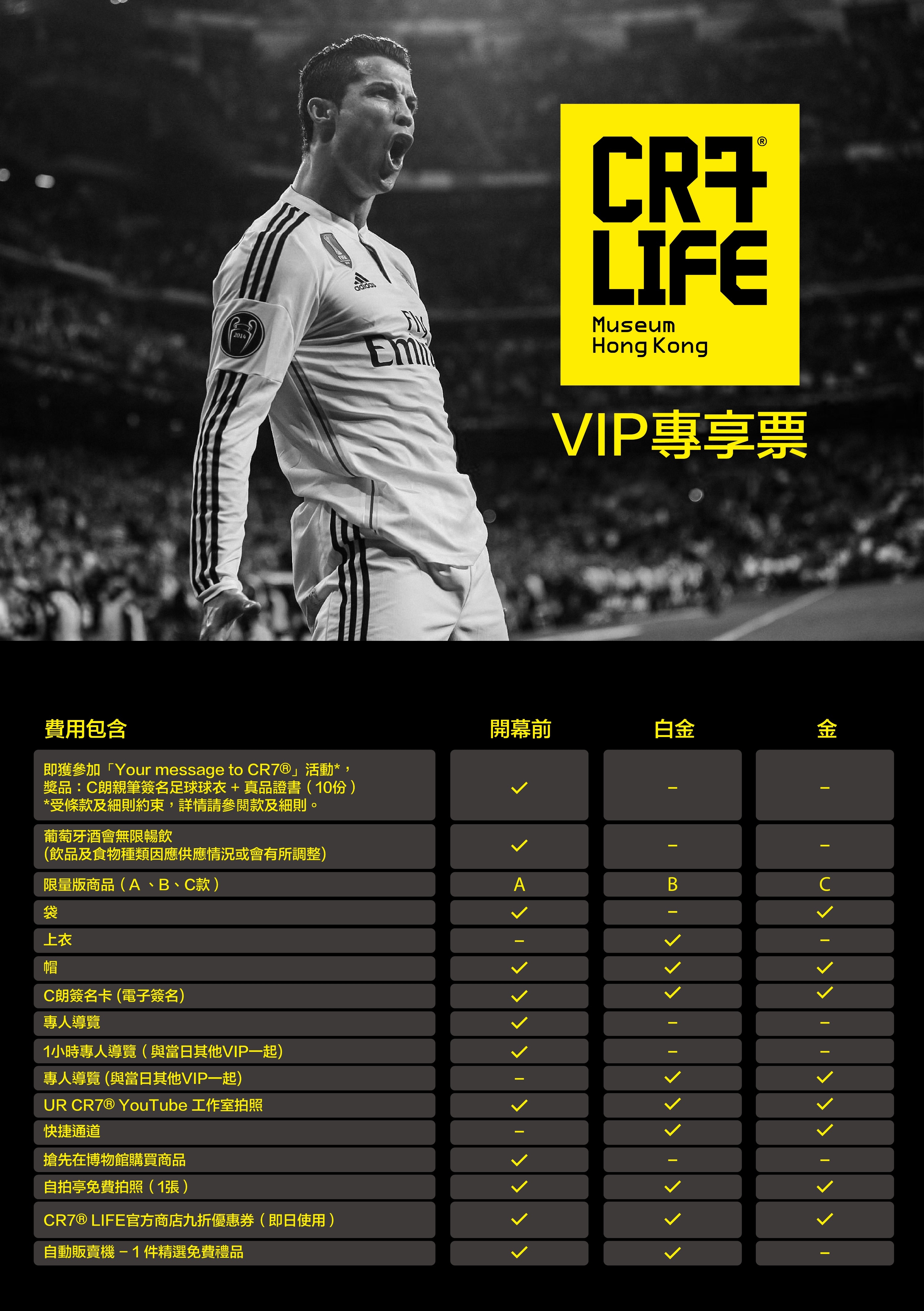 “CR7?生活博物館”門票今日(5日)正式開售,最貴的VIP門票售價(jià)4000港幣(折合人民幣3687.88元),可在博物館開幕前一至兩日進(jìn)場(chǎng)參觀,及參加抽獎(jiǎng),贏取C羅簽名T恤;成人票價(jià)180港幣,老人及兒童150港幣。