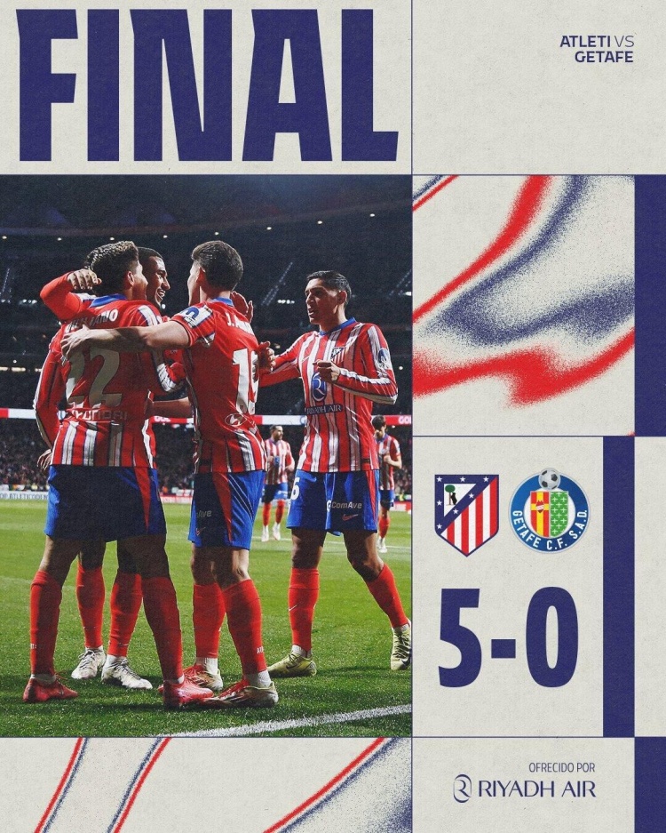 西班牙國王杯八強戰(zhàn),馬競5-0赫塔菲晉級四強。上半場,小西蒙尼雙響,阿爾瓦雷斯助攻利諾破門+失單刀;下半場,小西蒙尼破門無效,科雷亞傳射建功,索爾洛特推射破門。
