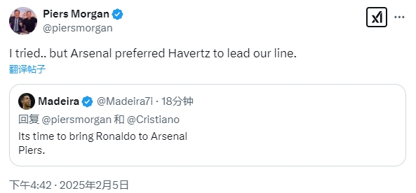 有球迷評論:“是時候把C羅帶到阿森納了,皮爾斯?!蹦Ω貜停骸拔以囘^了……但阿森納更喜歡讓哈弗茨來領銜我們的鋒線?!?/p>