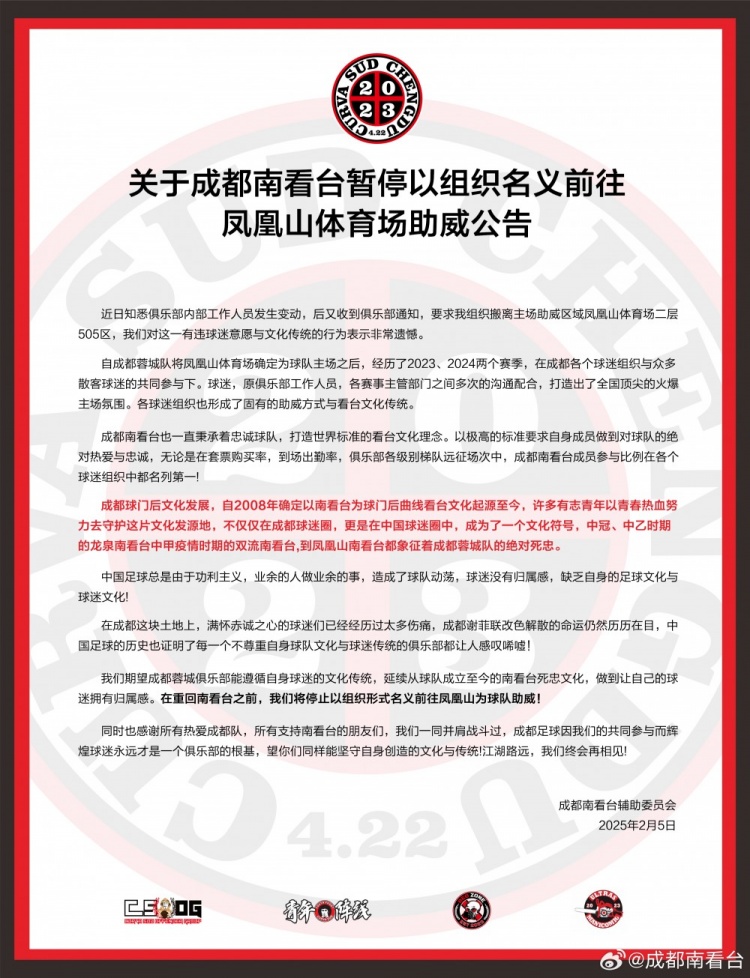 我們期望成都蓉城俱樂部能遵循自身球迷的文化傳統(tǒng),延續(xù)從球隊(duì)成立至今的南看臺死忠文化,做到讓自己的球迷擁有歸屬感。在重回南看臺之前,我們將停止以組織形式名義前往鳳凰山為球隊(duì)助威!