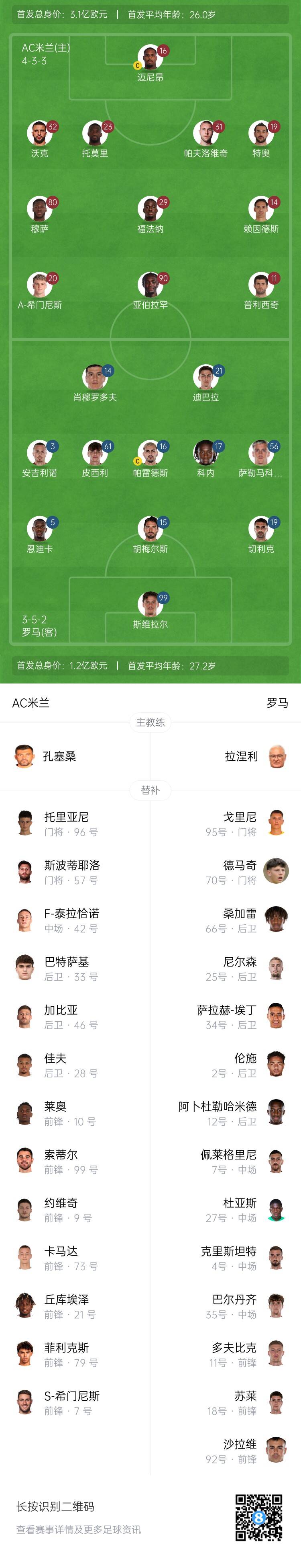 AC米蘭替補(bǔ):57-斯波蒂耶洛、96-托里亞尼、7-圣地亞哥-希門尼斯、9-約維奇、10-萊奧、21-丘庫埃澤、28-佳夫、33-巴特薩基、42-泰拉恰諾、46-加比亞、73-卡馬爾達(dá)、79-菲利克斯、99-索蒂爾