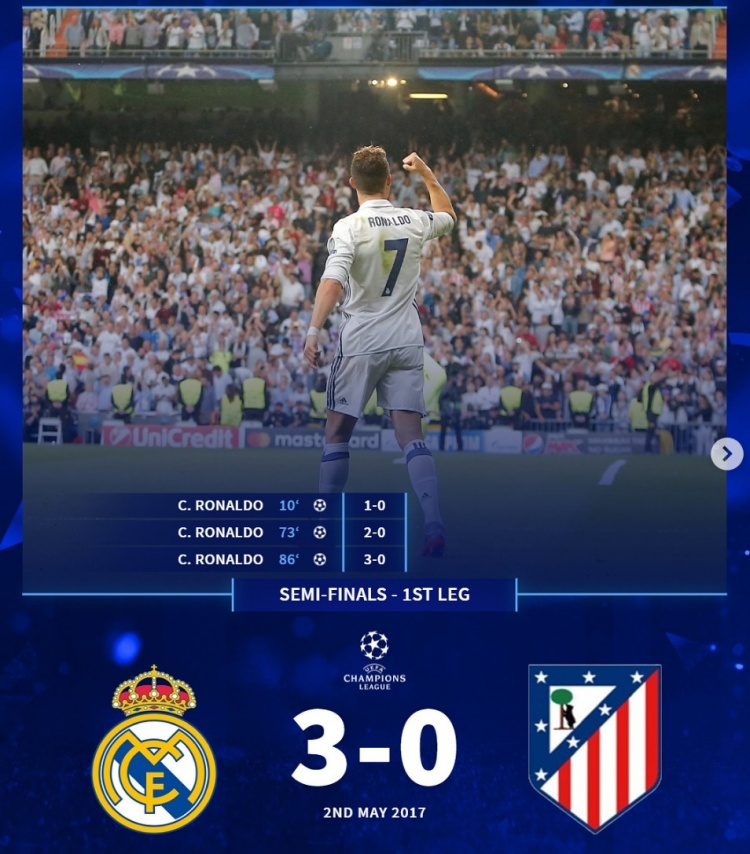 2017年5月歐冠半決賽首回合,皇馬主場3-0馬競:C羅上演帽子戲法,幫助皇馬確立大幅領(lǐng)先優(yōu)勢。
