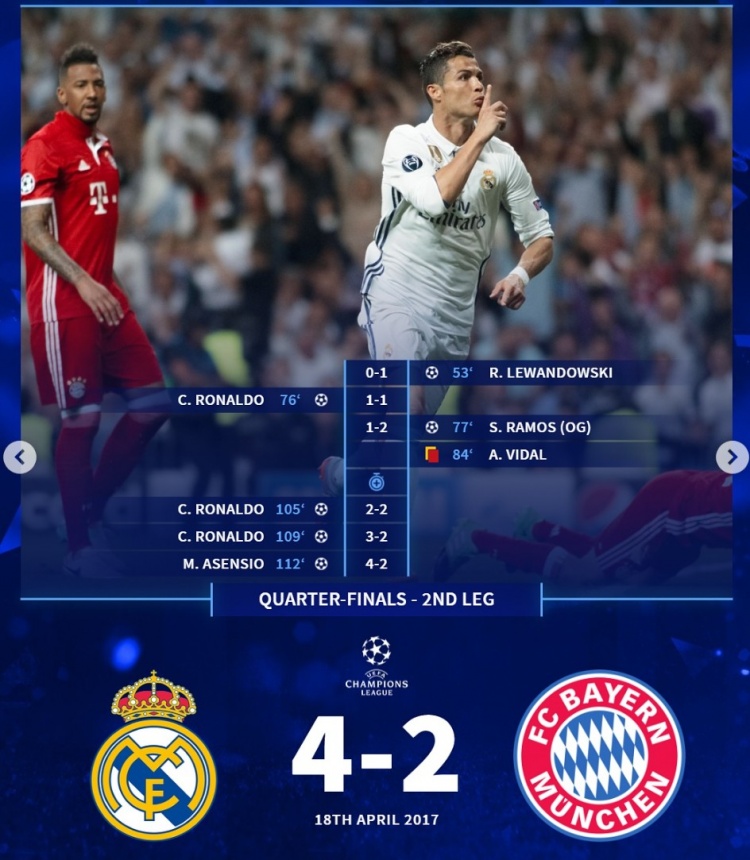2017年4月歐冠八強(qiáng)戰(zhàn)次回合,皇馬主場4-2拜仁:C羅上演帽子戲法,幫助皇馬淘汰拜仁。