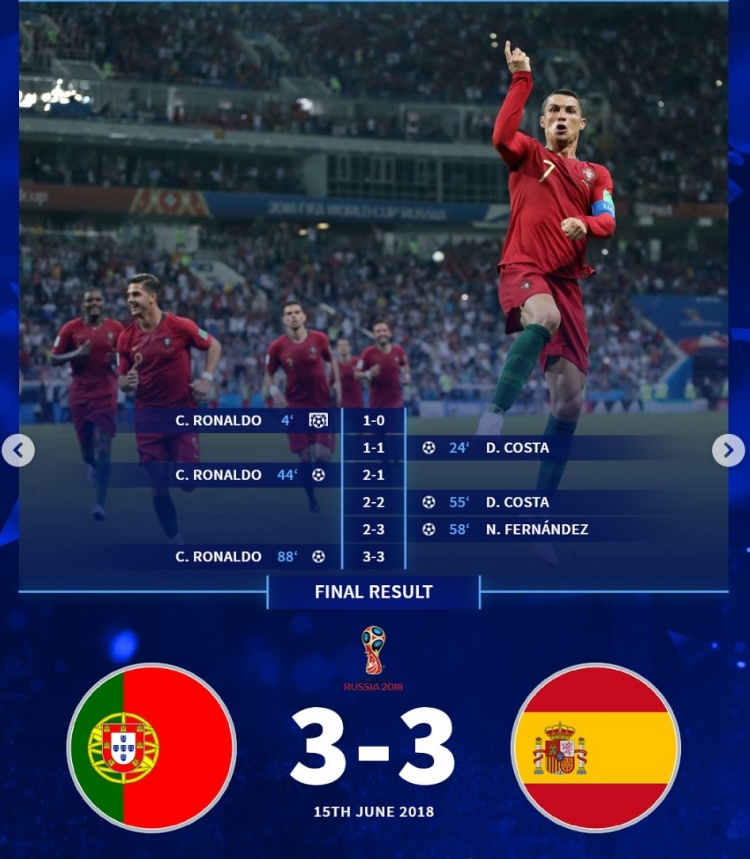 2018年世界杯小組賽,葡萄牙3-3西班牙:迭戈-科斯塔雙響,納喬穿云箭,C羅上演帽子戲法,最后的任意球破門更是因為他主罰前堅定的眼神,和央視解說“翩若驚鴻婉若游龍”成為經(jīng)典。
