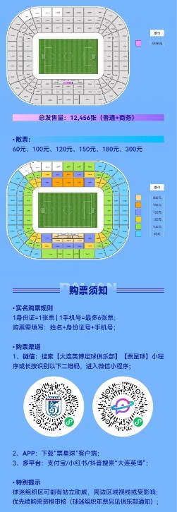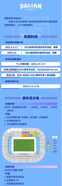 2月6日訊 大連英博俱樂(lè)部發(fā)布2025賽季票務(wù)公告,開(kāi)啟新賽季票務(wù)出售。