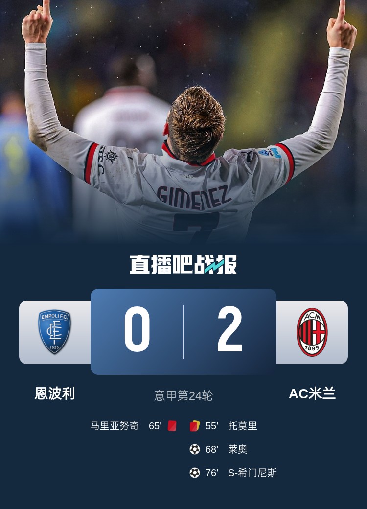 米蘭本輪2-0擊敗恩波利,雙方在下半場(chǎng)都被罰下一人,最終米蘭憑借萊奧和新援S-希門尼斯的進(jìn)球拿下勝利。