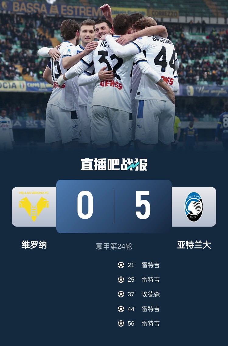 亞特蘭大本輪5-0橫掃維羅納,雷特吉大四喜成為本場(chǎng)絕對(duì)明星。