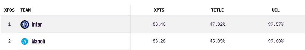 機(jī)構(gòu)演算數(shù)據(jù)顯示,國米本賽季意甲奪冠概率為47.9%,比目前排名榜首的那不勒斯高出近3個百分點(diǎn),那不勒斯奪冠概率為45%,機(jī)構(gòu)預(yù)測兩隊季末都是83個積分收官。