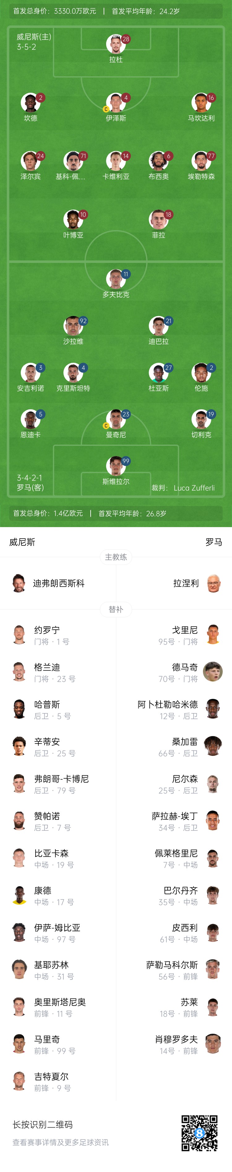 威尼斯首發(fā):28-拉杜、16-馬坎達(dá)利、4-埃澤斯、2-坎德、71-基科-佩雷斯、14-卡維利亞、6-布西奧、24-澤爾賓、77-埃勒特森、18-菲拉、10-耶博阿