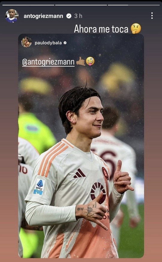 在第24輪意甲聯(lián)賽,羅馬客場1-0小勝威尼斯,迪巴拉在第57分鐘罰進點球。進球后迪巴拉模仿了法國前鋒格列茲曼的慶祝動作,賽后迪巴拉還在社媒上發(fā)布了自己的慶祝照片,并@格列茲曼。