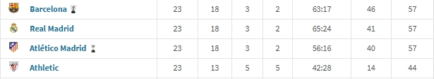 上一次23輪后出現(xiàn)如此焦灼的場(chǎng)面還是13/14賽季。那個(gè)賽季23輪后皇薩競3隊(duì)同積57分,分列前三。那個(gè)賽季爭冠也持續(xù)到最后一輪,最終馬競奪魁。